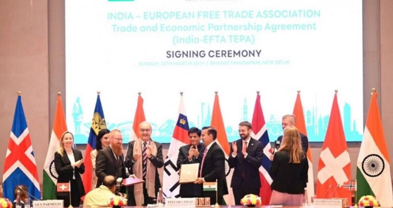 काठमाडौं– भारत र नर्वे तथा स्विट्जरल्यान्डसहित चार सदस्यीय युरोपेली ब्लक इएफटिएले लगानी र निर्यात प्रवर्द्धन गर्नका लागि आइतबार एक सय अर्ब डलरको स्वतन्त्र व्यापार सम्झौतामा हस्ताक्षर गरेका छन् ।