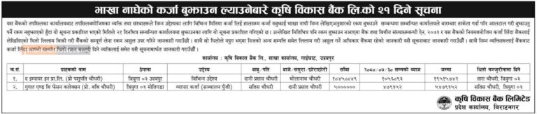 बैंकले जारी गरेको सूचनामा तोकिएको मितिमा कर्जा नबुझाएको खण्डमा बैंक तथा वित्तिय संस्था ऐन २०७३, बैंकको नियमानुसार धितो लिलाम बिक्री गरी असुर उपर गर्ने उल्लेख गरिएको छ ।