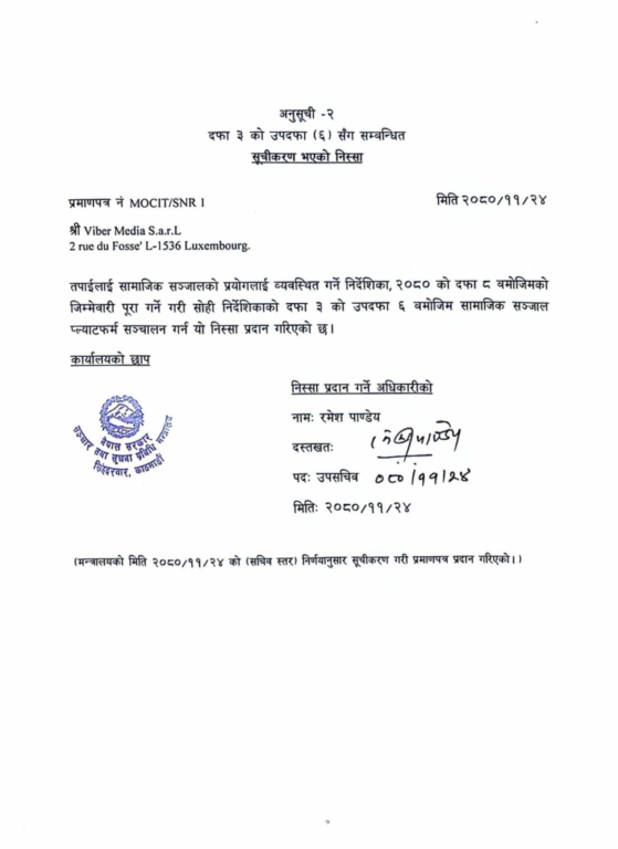 काठमाडाैं– नेपालमा भाइबर औपचारिक रुपमै सामाजिक सञ्जालका रुपमा सूचीकृत भएको छ । सामाजिक सञ्जालको प्रयोगलाई व्यवस्थित गर्ने सम्बन्धी निर्देशिका २०८० अनुसार पहिलोपटक भाइबर नेपालमा सूचीकरण भएको हो ।