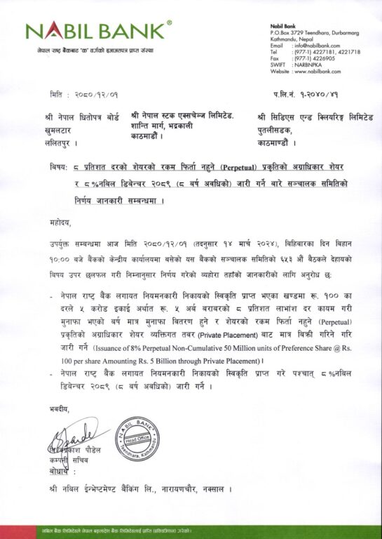 संचालक समितिको बैठकले ८ वर्षे अवधिका लागि पर्पेचुअल प्रकृत्तिको अग्राधिकार शेयर जारी गर्ने निर्णय गरेकाे छ । नियामक निकायले स्वीकृत दिएपछि उक्त शेयर जारी हुनेछ ।