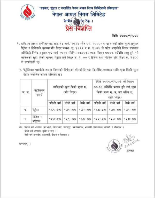 निगमले आजै मध्यरातदेखि लागू हुनेगरी पेट्रोलको १ र डिजेल तथा मट्टीतेलको मूल्य प्रतिलिटर २ रुपैयाँ घटाउने निर्णय गरेको हो। जसअनुसार काठमाडौंमा आइतबारदेखि पेट्रोलको मूल्य प्रतिलिटर १७१ र डिजेल तथा मट्टीतेलको १५८ रुपैयाँ पर्ने निगमले जारी गरेको निगमको विज्ञप्तिमा उल्लेख छ ।