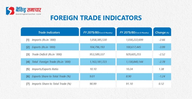 यसैगरि चालु आवको आठ महिनामा १ खर्ब ६१ करोड रुपैयाँ बराबरको निर्यात भएको छ । यो गत आव २०७९/८० को यसै महिनाको तुलनामा ३.९९ प्रतिशत कम हो।