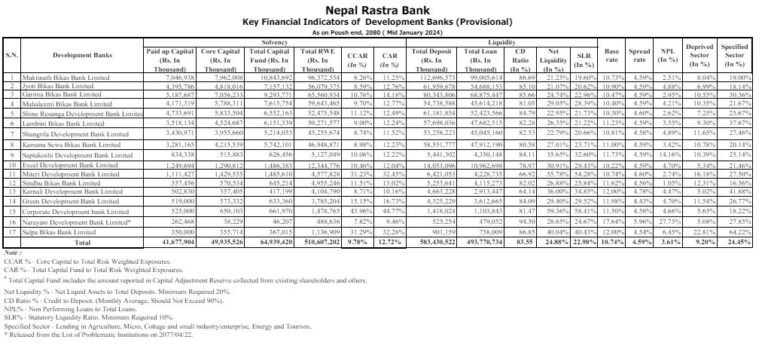 नेपाल राष्ट्र बैंकले सार्वजनिक गरेको विकास बैंकहरुको पछिल्लो तथ्यांकलाई हेर्ने हो भने १७ वटा विकास बैंकमध्ये १० वटाको खराब कर्जा ४ प्रतिशत भन्दा माथि छ । समग्रमा भने बैंकहरुको खराब कर्जा ३.६१ प्रतिशत रहेको छ।