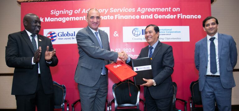 काठमाडौं । ग्लोबल आइएमई बैंक लिमिटेड र विश्व बैंक समूहको सदस्य अन्तर्राष्ट्रिय वित्त निगम (आईएफसी) बिच जोखिम व्यवस्थापन, जलवायु वित्त तथा लैङ्गिक वित्त क्षेत्रमा आईएफसीले परामर्श सेवा प्रदान गर्ने गरी एक समझदारी पत्रमा हस्ताक्षर भएको छ ।