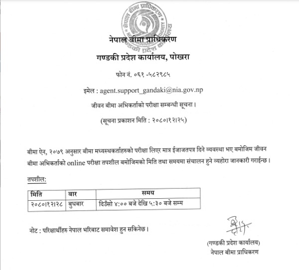 नेपाल बीमा प्राधिकरणको गण्डकी प्रदेश कार्यालय, पोखराले आज एक सूचना जारी गर्दै यही २८ गते बुधबार परीक्षा हुने जनाएको हो। अनलाइन माध्यमबाट हुने उक्त परीक्षामा देशभरका परीक्षार्थीहरु समावेश हुन पाउनेछन् ।