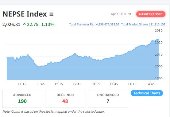 आज नेपाल नेपाल स्टक एक्सचेन्ज (नेप्से) परिसूचक २२.७५ अकंले बढेर २०२६.८१ बिन्दुमा बन्द भएको छ। आइतबार ३११ कम्पनीको १ करोड १२ लाख १० हजार १०२ कित्ता शेयर किनबेच हुँदा ४ अर्ब २५ करोड ६६ लाख ७६ हजार रुपैयाँँको कारोबार भएको छ।