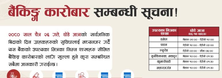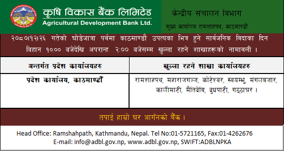 काठमाडौं– सरकारले घोडेजात्राको अवसरमा आज (सोमबार) सार्वजनिक बिदा दिएको छ। सार्वजनिक बिदाको दिनपनि आफ्ना ग्राहकहरुको आवश्यकतालाई मध्यनजर गर्दै अधिकांश वाणिज्य बैंक र विकास बैंकहरुले बैंकिङ्ग सेवा प्रदान गरिरहेका हुन् ।
