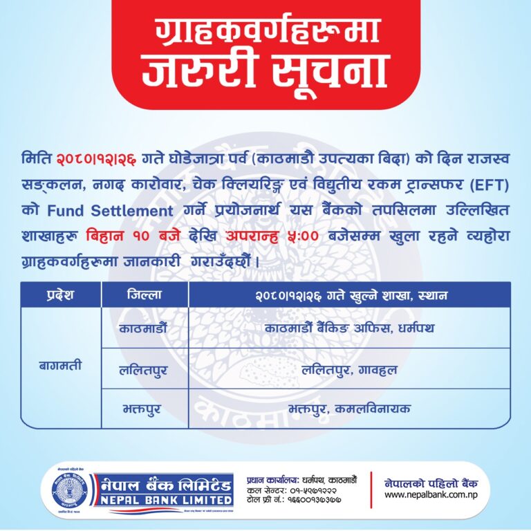 सम्पूर्ण शाखा संचालन नगरेपनि केहि शाखा मार्फत बैंकहरुले बिदाका दिन समेत सेवा प्रदान गरिहेका छन्।