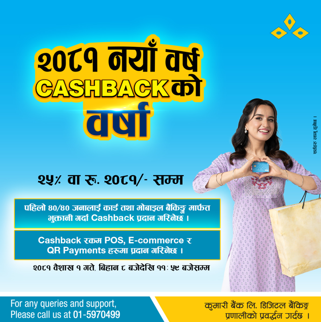 काठमाडौं–कुमारी बैंक लिमिटेडले नयाँ वर्ष वि.सं. २०८१ को उपलक्ष्यमा विशेष क्यासब्याक अफर घोषणा गरेको छ । यस योजना अन्तर्गत पि.ओ.एस. भुक्तानी र अनलाइन कारोबारका लागि बैंकको डेबिट वा क्रेडिट कार्ड प्रयोग गर्ने ग्राहकहरूले २०८१ रुपैयाँ वा कारोबार रकमको २५ प्रतिशत जुन रकम न्यून हुन्छ उक्त रकम फिर्ता पाउने छन् । साथै, क्यूआर. भुक्तानी मार्फत कारोबार गर्ने मोबाइल बैंकिङ्ग प्रयोगकर्ताहरूले पनि यो आकर्षक क्यासब्याक अफरको फाइदा उठाउन सक्न बैंकले जनाएको छ ।