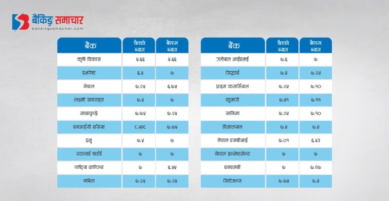 त्यस्तै, एभरेस्ट र एनएमबीले चैतको तुलनामा वैखाशाखमा ब्याजदर बढाएका छन्। नेपाल बैंक, लक्ष्मी सनराइज, माछापुच्छ्रे, प्रभु, राष्ट्रिय वाणिज्य, ग्लोबल आईएमई, सिद्धार्थ, प्राइम कमर्सियल, कुमारी, सानिमा, एसबीआई, सिटिजन्स र एनआईसी एशियाले ब्याजदर घटाएका छन्।
