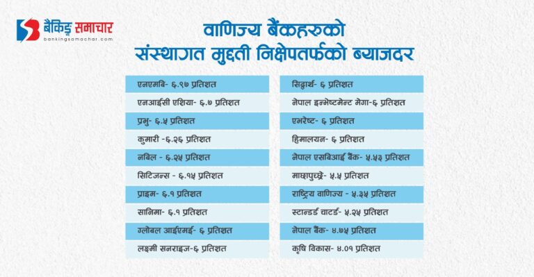 राष्ट्रिय वाणिज्य बैंकले वैशाखका लागि चैतकै ब्याजदर कायम राखेको छ । जुन ५.३५ प्रतिशत थियो । साथै स्टान्डर्ड चाटर्ड बैंकले पनि चैतकै ५.२५ प्रतिशत ब्याजदरलाई वैशाखका लागि निरन्तरता दिएको छ । नेपाल बैंकले भने वैशाखका लागि संस्थागत मुद्दती निक्षेप तर्फको ब्याजदर ४.७५ प्रतिशत तोकेको छ । चैतमा यो बैंकको यस्तो ब्याजदर ५ प्रतिशत थियो । संस्थागत मुद्दती निक्षेप तर्फ सबैभन्दा कम ब्याजदर तोक्ने बैंकको सूचीमा कृषि विकास बैंक रहेको छ । बैंकले वैशाखका लागि ४.०१ प्रतिशत ब्याजदर तोकेको छ । यो बैंकले पनि अघिल्लो महिनाको ब्याजदरलाई नै निरन्तरता दिएको हो ।