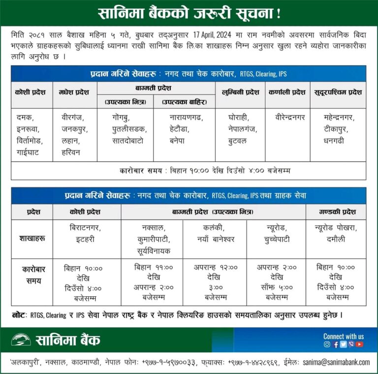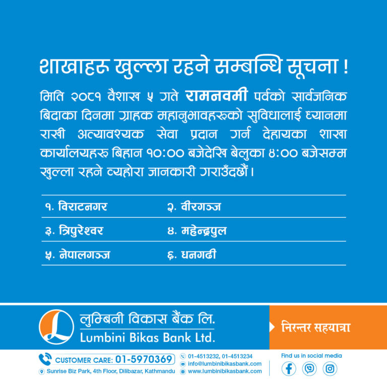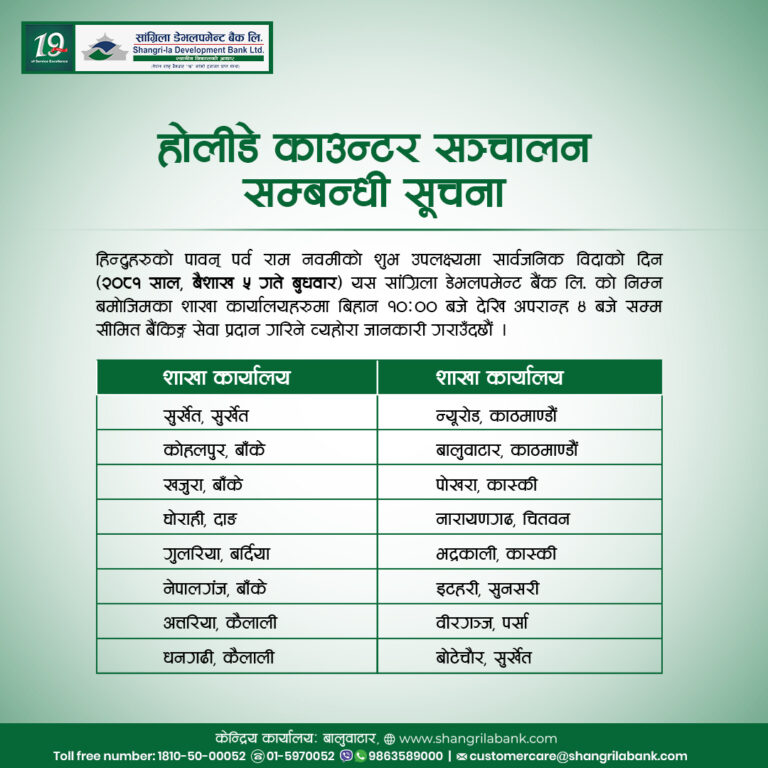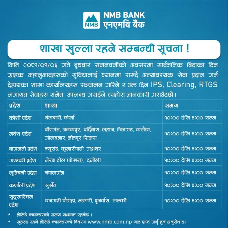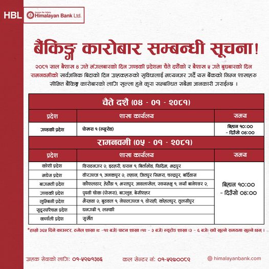 काठमाडौं– आज बैशाख ५ गते सार्वजनिक बिदाका दिन समेत अधिकांश बैंकहरुले बैंकिङ्ग सेवा प्रदान गरिरहेका छन् । बुधबार सरकारले रामनवमीको अवसरमा देशभर सार्वजनिक दिएकाले शेयर बजार, सरकारी कार्यालय, शैक्षिक संस्थाहरू बन्द छन् ।