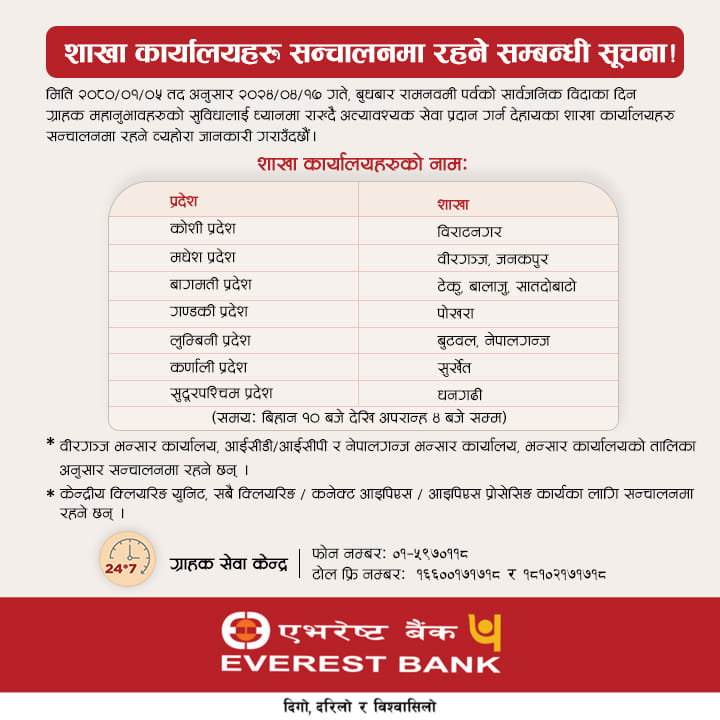 तर अधिकांश बैंकहरूले बैंकहरुले आफ्ना ग्राहकहरुको आवश्यकतालाई मध्यनजर गर्दै विभिन्न शाखा कार्यालय खुला राख्नेर सेवा दिइरहेका छन्। ती मध्ये कतिपय बैंकहरुले सूचना प्रकाशित गरेर शाखा खोल्ने जानकारी दिएका छन् ।