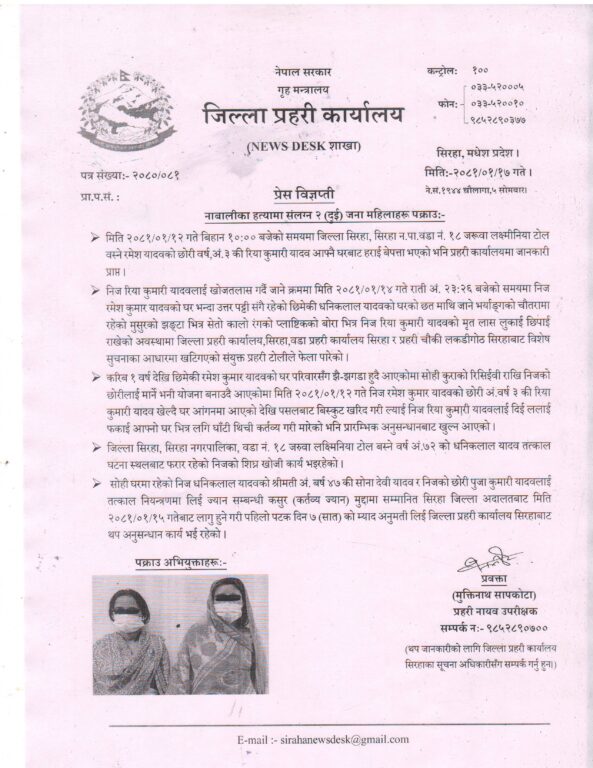 छिमेकी रमेश यादवकी तीन वर्षीया छोरी रिया कुमारीको हत्या गरेको आरोपमा आमाछोरीलाई जिल्ला प्रहरी कार्यालय सिरहाबाट खटिएको टोलीले पक्राउ गरिएको हो । गत वैशाख १२ गते बिहान १० बजेतिर घर अगाडि खेलिरहेकी रमेशकी छोरी रिया हराएकी थिइन् ।