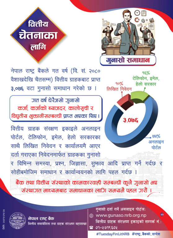 वित्तीय ग्राहक संरक्षण इकाइले अनलाइन पोर्टल, टेलिफोन, इमेल, हेलो सरकारका सार्थ लिखित निवेदन र कार्यालयमै आएर दर्ता गराएका निवेदनमार्फत ग्राहकका गुनासो र विभिन्न समस्या, प्रश्न, जिज्ञासा, सुझावहरूको सम्बोधन गरिएको बैंकले जनाएको छ ।
