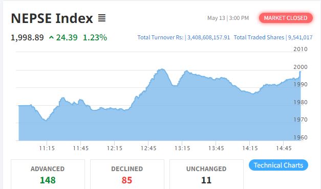 आज १४८ कम्पनीको शेयर मूल्य बढेको छ भने ८५ कम्पनीको शेयर मूल्य घटेको छ । आज सबैभन्दा धेरै नेपाल पुनर्बीमा कम्पनीको संस्थापक शेयर किनबेच भएको छ
