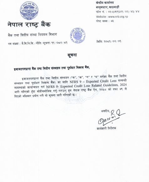यो मार्गदर्शनअन्तर्गत एनएफआरएस–९ आगामी आर्थिक वर्ष २०८१/८२ बाट अर्थात आउँदो साउन १ गतेबाट बैंक तथा वित्तीय संस्थाहरुले कार्यान्वयनमा ल्याउनुपर्नेछ।