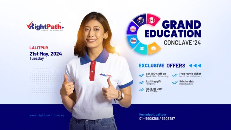काठमाडाैं – राइटपाथ करियर काउन्सिलिङले ललितपुरको कुमारीपाटीमा ‘ग्रान्ड एजुकेसन कन्क्लेभ–२०२४’ गर्ने भएको छ । देशका विभिन्न स्थानहरूमा ‘ग्रान्ड एजुकेसन कन्क्लेभ’ सम्पन्न गरिसकेको शैक्षिक परामर्शदाता संस्था राइटपाथले मंगलवार कुमारीपाटी स्थित आफ्नै कार्यालयमा ‘ग्रान्ड एजुकेसन कन्क्लेभ’ गर्न लागेको हो।