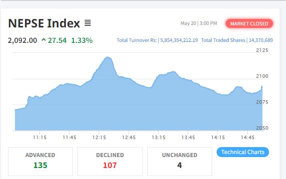 काठमाडाैं – नेपाल स्टक एक्सचेञ्ज (नेप्से) परिसूचक सोमबार पनि दाेह्राेराे अंकले बढेकाे छ । आज नेप्से परिसूचक आज २७.५४ अकंले बढेर २०९२.०० को बिन्दुमा कायम भएको हो। नेपाल राष्ट्र बैंकले चालु आर्थिक वर्ष २०८०/८१ को मौद्रिक नीतिको त्रैमासिक समीक्षामार्फत् कर्जा प्रवाह विस्तारमा केहि लचिलो नीति लिएपछि त्यसको सकारात्मक शेयर बजारमा देखिएको छ। जसका कारण माैद्रिक नीतिकाे समिक्षा प्रश्चात् शेयर बजार लगातार आइतबार र सोमबार बढेको हो ।
