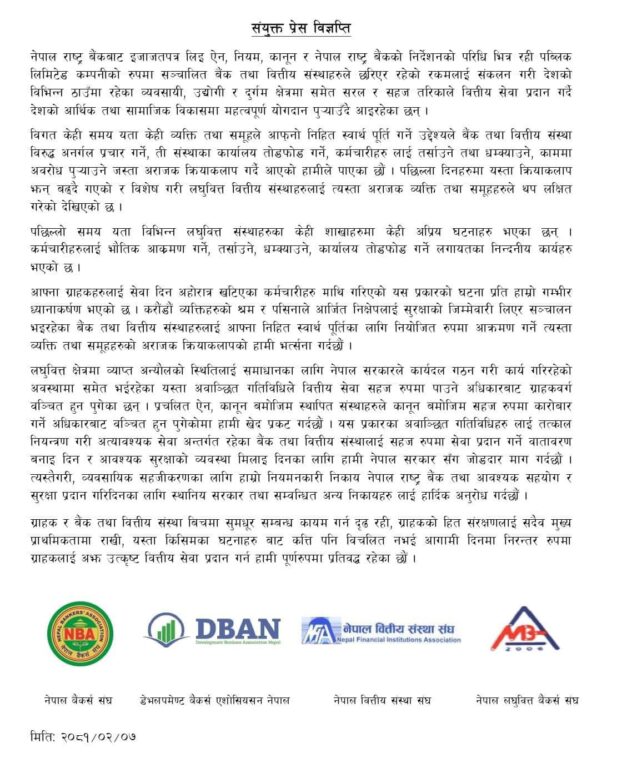 चार संगठनद्वारा जारी विज्ञप्तिमा भनिएको छ,‘विगत केही समय यता केही व्यक्ति तथा समूहले आफ्नो निहित स्वार्थ पूर्ति गर्ने उद्देश्यले बैंक तथा वित्तीय संस्था विरुद्ध अनर्गल प्रचार गर्ने, ती संस्थाका कार्यालय तोडफोड गर्ने, कर्मचारीहरु लाई तर्साउने तथा धम्क्याउने, काममा अवरोध पुर्याउने जस्ता अराजक क्रियाकलाप गर्दै आएको हामीले पाएका छौं। पछिल्ला दिनहरुमा यस्ता क्रियाकलाप झन् बढ्दै गएको र विशेष गरी लघुवित्त वित्तीय संस्थाहरुलाई त्यस्ता अराजक व्यक्ति तथा समूहहरुले थप लक्षित गरेको देखिएको छ।’