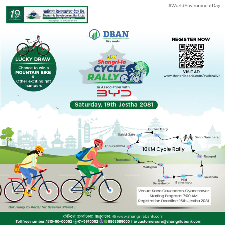 काठमाडौं । विश्व वातावरण दिवसका अवसरमा यही जेठ १९ गते शनिवारका सांग्रिला डेभलपमेन्ट बैकले साइकल र्याली गर्ने भएको छ । ‘इन्धन बचाऔँ, वातावरण जोगाऔँ’ भन्ने नाराका साथ डेभलपमेन्ट बैंकर्स एशोसिएसन नेपाल, बिवाइडी तथा अन्य संघसंस्थाहरुसँगको सहकार्यमा साइकल र्याली आयोजना गरिएको हो। साइकल र्यालीमा सहभागी हुन चाहने इच्छुकहरूले https://www.shangrilabank.com/cyclerally/ मा निःशुल्क दर्ता गरी आफ्नो सहभागिताको सुनिश्चितता गर्न सकिन्छ । उक्त साइकल र्याली जेठ १९ गते बिहान ७ः०० बजेदेखि शुरु हुनेछ ।