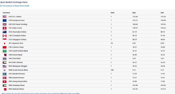 त्यस्तै, आज युरो एकको खरिद दर १४३ रुपैयाँ ७५ पैसा र बिक्री दर १४४ रुपैयाँ ४० पैसामा झरेको छ। बेलायती पाउण्ड एकको खरिद दर १६८ रुपैयाँ ६८ पैसा र बिक्री दर १६९ रुपैयाँ ४५ पैसा रहेको छ।