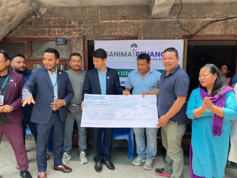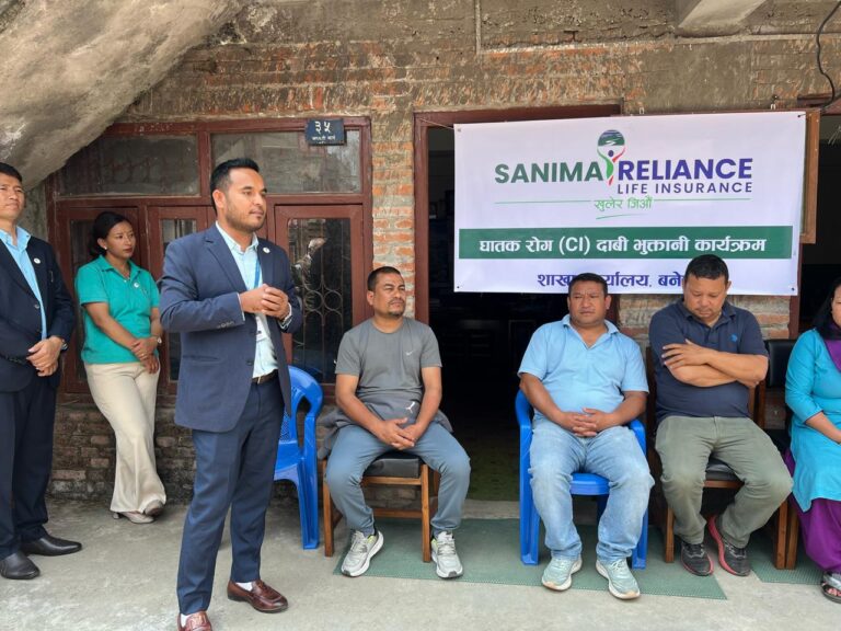 काठमाडौं –सानिमा रिलायन्स लाइफ इन्स्योरेन्स लिमिटेडले घातक बीमा दाबी भुक्तानी गरेको छ। कम्पनीको बिमित सन्जय कोजुको कार्यलय धुलिखेल नगरपालिका –६ मा नै पुगेर पचास लाखको चेक कम्पनीको वरिष्ठ एजेन्सी मेनेजर एन.बि.गुरुङ मार्फत हस्तान्तरण गरेको हो। कार्यक्रममा क्षेत्रीय प्रमुख बलराम खत्री ,एरिया म्यानेजर शनि खाछे श्रेष्ठ, सन्तोष श्रेष्ठ,मार्केटिङ अफिसर सुनिता के.सी, जनप्रतिनिधिहरू लगायतको उपस्थिति रहेको थियो।