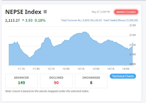 काठमाडौं – नेपाल स्टक एक्सचेञ्ज (नेप्से) ३.९३ अकंले बढेर २१११.६१ बिन्दुमा बन्द भएको छ। सोमबार ३१७ कम्पनीको ९३ लाख ३० हजार २९५ कित्ता शेयर किनबेच हुँदा ३ अर्ब ८९ करोड ३७ लाख ६४ हजार रुपैयाँको कारोबार भएको हो।