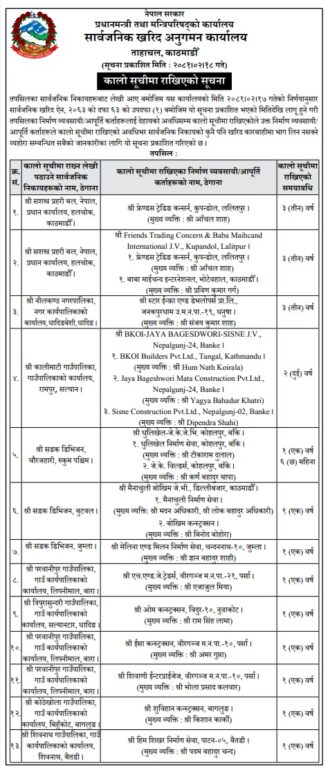 कार्यालयले फ्रेन्ड्स ट्रेडिङ कन्सर्न ललितपुर, स्टार इन्फ्रा एन्ड डेभलोपर्स प्रालि धनुषा र बाबा माइनचन्द इन्टरनेशनल भोटेबहालाई तीन–तीन वर्षका लागि खराब सूचीमा राखेको छ। यसैगरी, अन्य निमार्ण कम्पनीलाई क्रमशः दुई वर्ष, एक वर्ष र ६ महिनाका लागि खराब सूचीमा राखेको छ।
