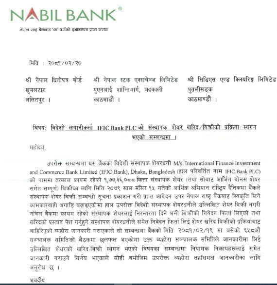 आईएफआईसीको नबिल बैंकमा रहेकाे विद्यमान शेयर कायमै राख्ने निर्णय भएकाे छ । नबिल बैंकमा कायम रहेको संस्थापक शेयरलाई निरन्तरता दिने भनी आईएफआईसीले बिक्रीको निवेदन फिर्ता लिएको तथा खरिदको प्रस्ताव पेस गर्ने संस्थापक शेयरधनीले समेत निवेदन फिर्ता लिई शेयर खरिदबिक्रीको प्रक्रियाबाट बाहिरिएको जानकारी गराएको छ।