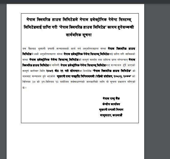 अब नेपाल इलेक्ट्रोनिक पेमेन्ट सिस्टम्सको सम्पूर्ण कारोबार नेपाल क्लियरिङ हाउसबाट हुने