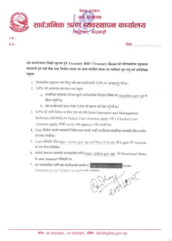 कार्यालयले २८ दिने ८ अर्ब रुपैयाँ ९१ दिने ६ अर्ब १० करोड ५० लाख रुपैयाँ, १८२ दिने १० अर्ब रुपैयाँ र ३६४ दिने ६ अर्ब ८३ करोड रुपैयाँको ट्रेजरी बिल नवीकरण गर्ने भएकाे हाे।