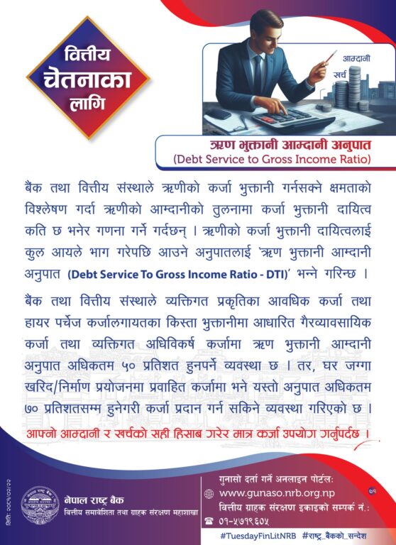 काठमाडाैं – नेपाल राष्ट्र बैंकले ऋण भुक्तानी आम्दानीको विषयमा जानकारी दिँदै आम्दानी र खर्चको सही हिसाब गरेरमात्र कर्जा उपयोग गर्न आग्रह गरेको छ। राष्ट्र बैंकले मंगलबार वित्तीय चेतनाका लागि सूचना जारी गर्दै ऋण भुक्तानी आम्दानीको विषयमा जानकारी दिएको हो।