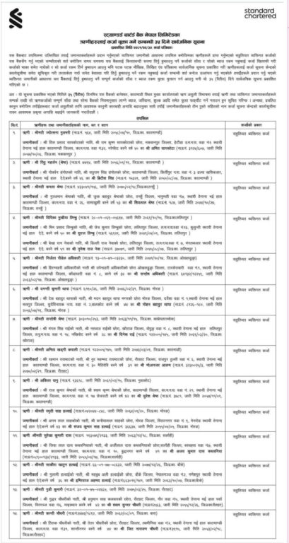 काठमाडौं – स्टयाण्डर्ड चार्टर्ड बैंकबाट सहुलियत व्यक्तिगत कर्जा लिने १४ ऋणी खराब सूचीमा परेका छन्। १४ जना ऋणीहरू समयमा नै कर्जा भुक्तानी नगरेपछी खराब सूचीमा परेका हुन्। बैंकबाट लिएको कर्जाको साँवा, ब्याज लगायत दस्तुर भुक्तानी नगरेपछी बैंकले खराब सूचीमा राखेको जनाएको छ। बैंकले ऋणीहरूलाई कर्जाको साँवा, ब्याज, हर्जना भुक्तानी गर्न ३५ दिन म्याद दिएकाे छ।