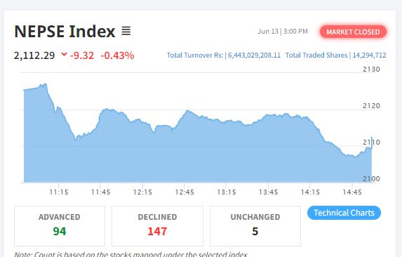 काठमाडौं – साताको अन्तिम कारोबारको दिन बिहीबार शेयर बजार घटेको छ । आज नेपाल स्टक एक्सचेञ्ज (नेप्से) ९.३२ अकंले घटेर २११२.२९ बिन्दुमा बन्द भएको छ। बिहीबार ३१३ कम्पनीको १ करोड ४२ लाख ९४ हजार ७१२ कित्ता शेयर किनबेच हुँदा ६ अर्ब ४४ करोड ३० लाख २९ हजार रुपैयाँको कारोबार भएको छ ।