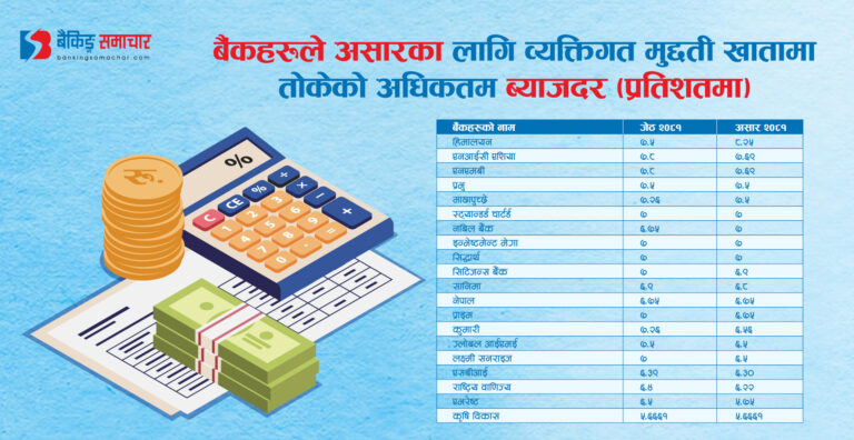 काठमाडौं – असार महिनाका लागि वाणिज्य बैंकहरूले नयाँ ब्याजदर सार्वजनिक गरेका छन्। वाणिज्य बैंकहरुले शुक्रबार सार्वजनिक सूचना प्रकाशित गर्दै असारका लागि नयाँ ब्याजदर तोकेका हुन्। जेठमा ब्याजदर घटाएका वाणिज्य बैंकहरुले असारमा थप ब्याजदर घटाएका छन्।