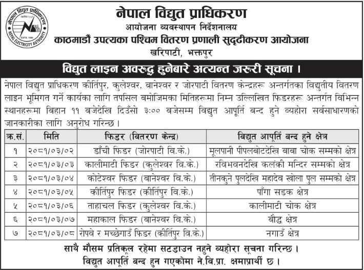 त्यस्तै, ६ गते ताहाचल फिडरअन्तर्गतको कालीमाटी चोक क्षेत्र, ७ गते बौद्ध क्षेत्र र ८ गते नगाउँ क्षेत्रमा बिहान ११ बजेदेखि दिउँसो ३ बजेसम्म बिजुली कटौती हुने भएको छ।