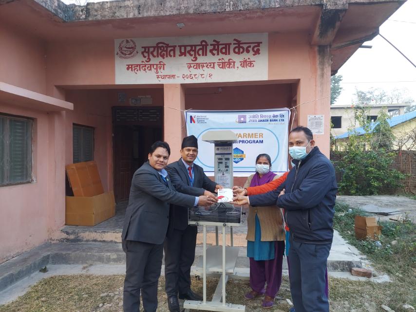 ज्योति विकास बैंकले प्युठानको भिंग्री प्राथमिक स्वास्थ्य केन्द्र, बाँकेको महादेवपुरी स्वास्थ्य चौकी,बर्दिया जिल्ला अस्पताल र जाजरकोटको स्वास्थ्य सेवा कार्यालय गरि थप ४ ठाउँमा राष्ट्रिय आविष्कार केन्द्रद्वारा स्वदेशमै निर्मित बेबी वार्मर प्रदान गरेको छ। बैंकले यी विभिन्न अस्पतालहरुलाई नवजात शिशुको शारिरिक तापक्रम उचित राख्न प्रयोग हुने बेबी वार्मर प्रदान गरेको हो ।