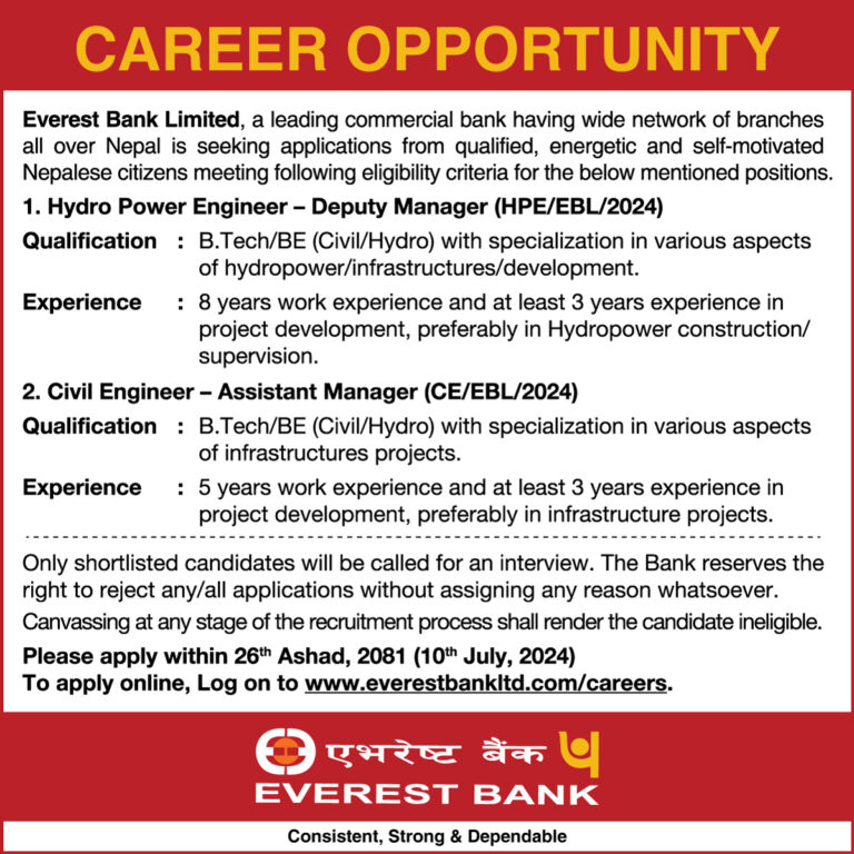 काठमाडौं – एभरेष्ट बैंकले कर्मचारी माग गरेको छ। कम्पनीले एक सूचना प्रकाशित गर्दै दुई पदका लागि दरखास्त आह्रवान गरेको हो ।