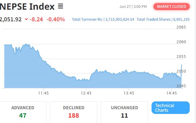 काठमाडौं – साताको अन्तिम काराेबारकाे दिन बिहीबार शेयर बजार घटेर बन्द भएको छ । आज शेयर बजार नेप्से परिसूचक ८ दशलमव २४ अंकले घटेर २,०५१ को विन्दुमा कायम भएको छ। आज ४७ कम्पनीको मूल्य बढेको छ भने १८८ कम्पनीको मूल्य घटेको छ ।