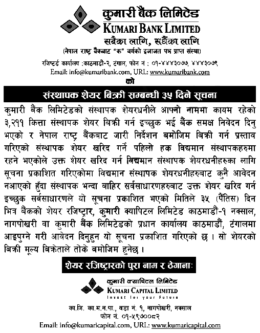 काठमाडौं – कुमारी बैंक लिमिटेडले संस्थापक शेयर बिक्रीमा ल्याएको छ। बैंकले संस्थापक शेयरधनीको नाममा रहेको ३ हजार २११ कित्ता संस्थापक शेयर सर्वसाधारणका लागि बिक्रीमा ल्याएको हो।