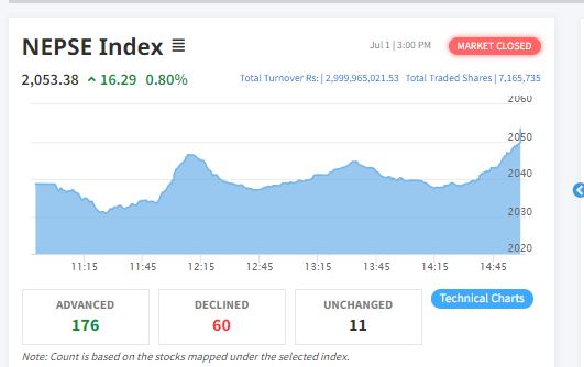 काठमाडौं – साताको दोस्रो कारोबारको दिन सोमबार शेयर बजारमा हरियाली छाएको छ। आज नेपाल स्टक एक्सचेञ्ज (नेप्से) १६.२९ अकंले बढेर २०५३.३८ बिन्दुमा बन्द भएको छ ।