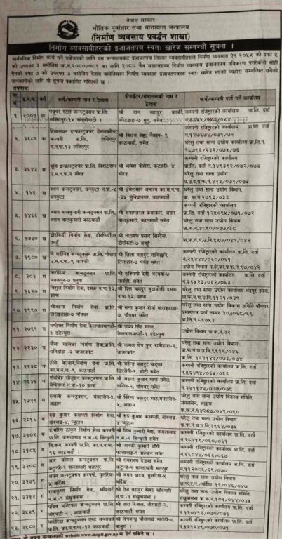 त्यसैगरी, श्रीजंगा निर्माण सेवा (पाँचथर), घण्टेश्व निर्माण सेवा प्रालि (डडेल्धुरा), नौला मालिका निर्माण सेवा (जाजरकोट), ठोसे केआर निर्माण सेवा (काठमाडौं), एभ्रिथिङ सोलुसन कन्स्ट्रक्सन प्रालि (झापा), रुपाली कन्स्ट्रक्सन (अछाम) र रुद्रकुमार कक्षपती निर्माण सेवा (प्युठान) ले पनि इजाजपत्र नवीकरण गरेका छैनन्। यसैगरी, इजाजतपत्र रद्द हुनेमा सिन्धुलीको ई. मरिण ठाकुर निर्माण सेवा, काठमाडौंको विकन कम्पनी प्रालि, भक्तपुरको आर कोमल कन्स्ट्रक्सन, बर्दियाको अमन कन्स्ट्रक्सन, संखुवासभाको राधाकृष्ण निर्माण सेवा, र काठमाडौंकै पवित्र मल्टिपल कन्स्ट्रक्सन तथा फ्लोरिडा कन्स्ट्रक्सन प्रालि रहेका छन् ।