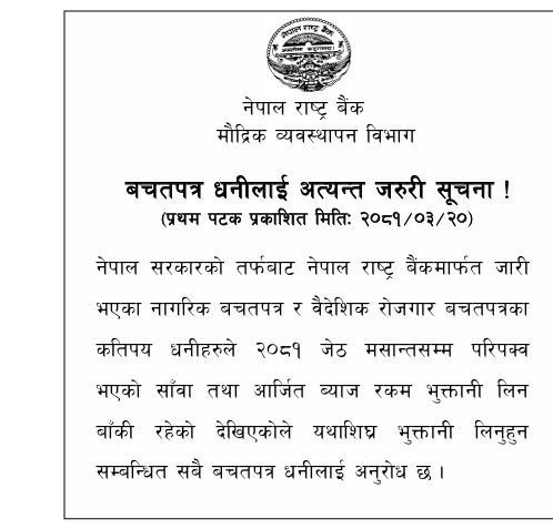 राष्ट्र बैंकले २०८१ जेठ मसान्तसम्म परिपक्व भएको बचतपत्रका साँवा तथा आर्जित ब्याज रकम लिन बचतकर्तालाई आग्रह गरेकाे हाे। ‘नेपाल सरकारको तर्फबाट नेपाल राष्ट्र बैंकमार्फत जारी भएका नागरिक बचतपत्र र वैदेशिक रोजगार बचतपत्रका कतिपय धनीहरुले २०८१ जेठ मसान्तसम्म परिपक्व भएको साँवा तथा आर्जित ब्याज रकम भुक्तानी लिन बाँकी रहेको देखिएकोले यथाशिघ्र भुक्तानी लिनुहुन सम्बन्धित सबै बचतपत्र धनीलाई अनुरोध छ’ विभागद्वारा जारी सूचनामा उल्लेख छ।