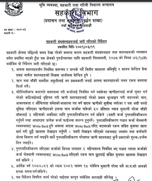 काठमाडौं – गत वर्ष खराब ऋणीको सूचीमा नपरेका सहकारीका ऋणीले पाकेको ब्याजको ५० प्रतिशत भुक्तानी गर्दा ३ महिनाका लागि कर्जा पुनर्तालिकीकरण गर्न पाउने भएका छन्। सहकारी विभागले एक सूचना जारी गर्दै उक्त निर्देशन दिएको हो। यसरी कर्जा पुनर्तालिकीकरण गर्दा यसअघि यस्तो सुविधा नलिएका ऋणीको मात्रै उक्त सुविधा पाउने विभागले जनाएको छ।