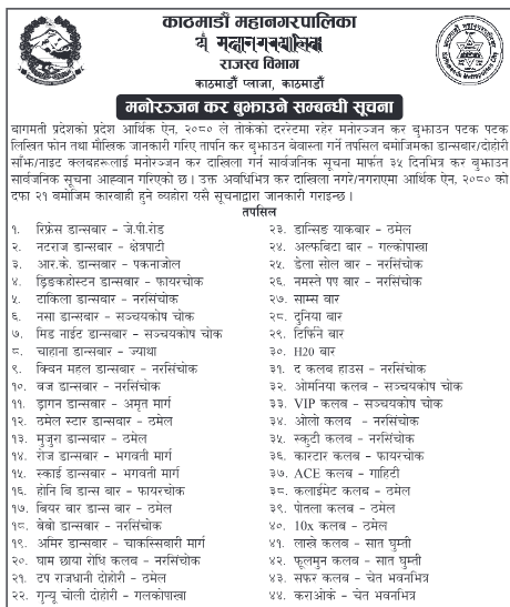 काठमाडौं – काठमाडौं महानगरपालिकाले क्लब, दोहोरी तथा बारहरूलाई मनोरञ्जन कर तिर्न आग्रह गरेको छ। मंगलबार एक सूचना निकाल्दै महानगरको राजस्व विभागले मनोरञ्जन व्यवसाय गर्ने ४४ क्लब, दोहोरी तथा बारहरूलाई ३५ दिनभित्र कर तिर्न आग्रह गरेको हो।