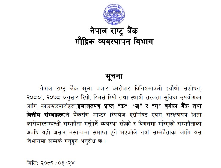 राष्ट्र बैंकले मंगलबार सूचना जारी गर्दै क, ख, ग बर्गका बैंक तथा अन्य वित्तीय संस्थाहरूलाई सम्झौता गर्न आग्रह गरेकाे छ। बैंकहरुले राष्ट्र बैंकको बिभिन्न उपकरणबाट तरलता सुविधा लिन उक्त सम्झौता गर्नुपर्ने राष्ट्र बैंक खुला बजार कारोबार विनियमावलीमा व्यवस्था छ ।