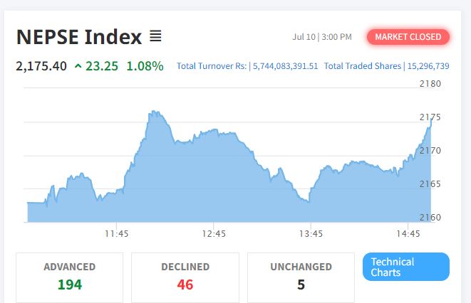काठमाडौं – साताको चौथो कारोबारको दिन बुधबार शेयर बजारमा दोहोरो अंकको बृद्धि भएको छ। आज शेयर बजार नेप्से परिसूचक २३ दशलमव २५ अंकले बढेर २,१७५ को विन्दुमा कायम भएको छ। आज १९४ कम्पनीको शेयर मूल्य बढेको छ भने ४६ कम्पनीको शेयर भाउ घटेको छ।