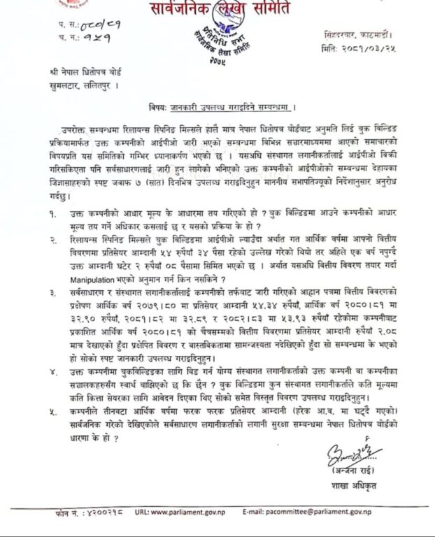 संघीय संसदको सार्वजनिक लेखा समितिले एक साताको समय दिएर नेपाल धितोपत्र बोर्डसँग रिलायन्स मिल्सको आईपीओ सम्बन्धमा स्पष्टिकरण माग गरेको छ । आम सर्वसाधारणलाई वित्तीय विवरणमा झुक्याएर महङ्गो मूल्यमा बुक बिल्डिङबाट आईपीओ निष्कासन गर्न लागेको उक्त कम्पनीको आईपीओ अनुमतिदेखिका विषय समेटेर लेखा समितिले बोर्डसँग जवाफ माग गरेको हो ।