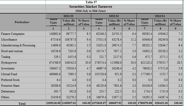 चालु आर्थिक वर्ष २०८०/८१ को जेठ महिनासम्ममा नेप्सेमा रहेका १३ समूह, बैङ्कहरूको ऋणपत्र, संस्थापक शेयर र अग्राधिकार शेयर गरी १ अर्ब ७८ करोड ७० हजार कित्ता शेयर किनबेच भएको हो । उक्त कारोबार गत आर्थिक वर्षको सोही तुलनाको अवधि भन्दा ६५.५१ प्रतिशतले बढी कारोबार हो । गत आर्थिक वर्षको ११ महिनामा १ अर्ब ७ करोड ३८ लाख ४९ हजार कित्ता बराबरको ३ खर्ब ८६ अर्ब ६९ करोड ७९ लाख रुपैयाँको शेयर खरिद बिक्री भएको थियो।